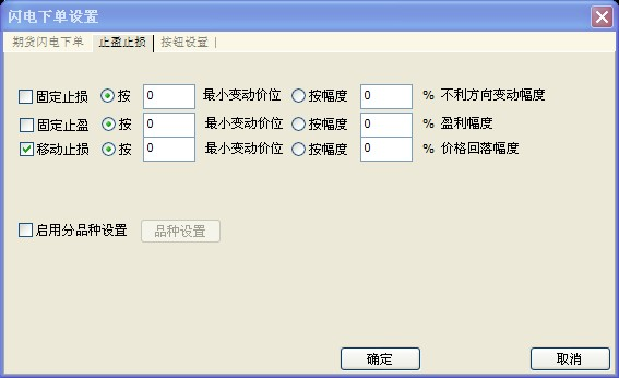系统默认设置为不勾选(呈灰色状态),若要更改设置需先勾选,也可在下单确认窗口中更改。 1、勾选固定止损,设置不利方向:满足N个最小变动价位,或者按N%变动幅度,固定止损生效。 2、勾选固定止盈,设置有利方向:满足N个最小变动价位,或者按N%盈利幅度,固定止盈生效。 3、勾选移动止损,设置有利方向:回落N个最小变动价位,或者按N%价格回落幅度,移动止损生效。 4、启用分品种下单设置:系统默认为不勾选,若勾选需要对不同品种所对应不同的止损止赢进行设置,包括品种、止损、止盈、移动止损(可双击代码或者使用键盘精灵改变品种)。