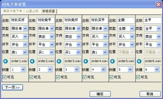 也可根据个人习惯,对按钮的名称、类型(市价、现价、全撤、全平)、方向(买入、卖出)、开平(开仓、平仓、平今、平昨)、位置(买1、卖1、不需指定)、音效(本地电脑中.wav声音文件)、快捷(0- 9)进行更改,若勾选“可见”即可在闪电下单界面显示(注:可见按钮数不能少于两个并且必须是2的倍 数),设置完成后点击“确定”,如下图: